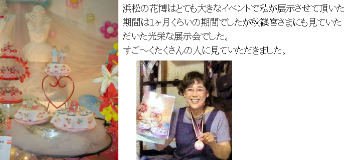 テレビでシュガーケーキの美しさに感動しもっと見たいと思ってネットで検索したところ浜松で教えてくださる先生が私を受け入れてくださったので浜松まで通いましたちょうどその頃、私が足心道の施術をさせて頂いていた女性(30代前半の方)に「いくつになっても元気なればやりたいことが出来ますよ」ということを伝えたかったのです浜松まで通うのは大変ですが美しいものが出来上がるととても嬉しくて楽しかったです